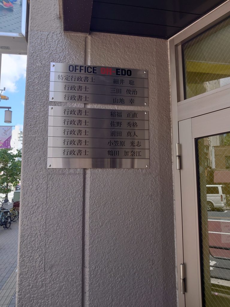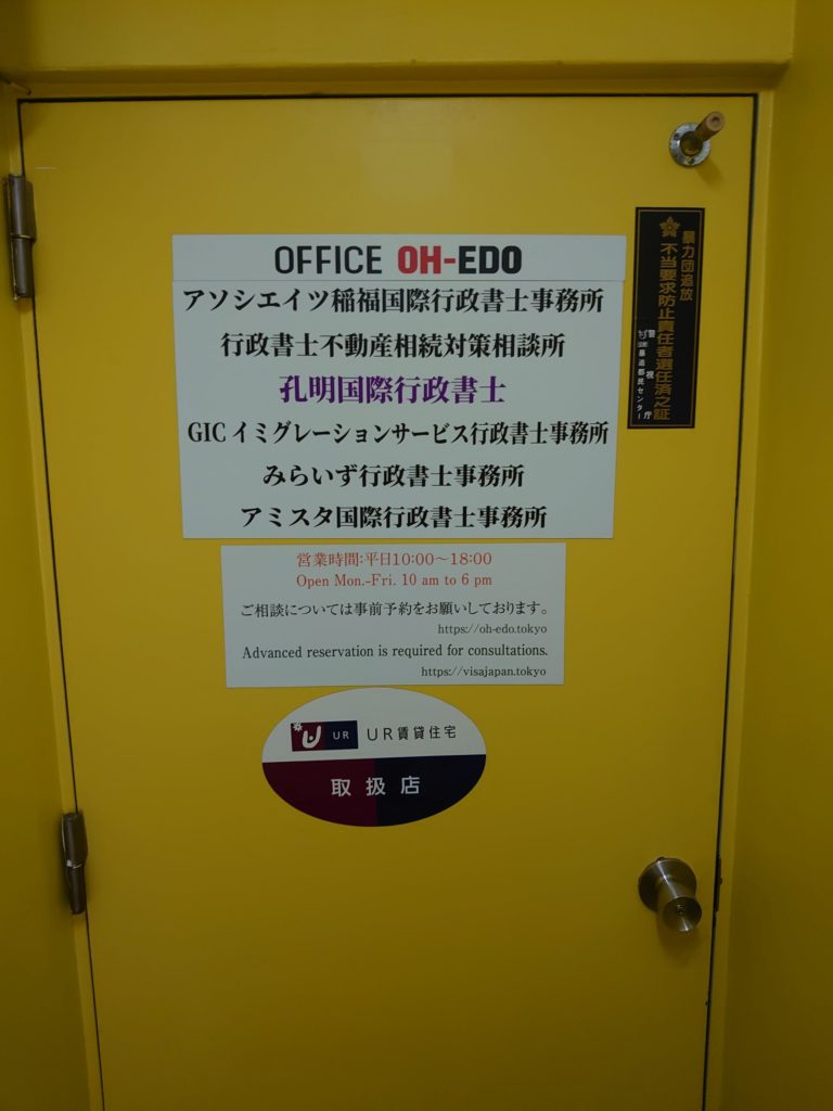 办公室入口处展示有联合办公的行政书士事务所列表。孔明国际行政书士事务所以紫色显示。